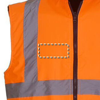 Bodywarmer personnalisé Yoko® réversible haute visibilité. La face haute-visibilité de ce produit est fabriqué en 100% polyester enduction PU et l'autre face est en polyester polaire de couleur bleu marine. La face haute-visibilité de ce bodywarmer personnalisé contient 2 bandes verticales et 2 bandes horizontales réfléchissantes cousues de 5cm de largeur. Cette partie est également conforme à la spécification EN ISO20471:2013 Class 2. Ce produit est idéal pour les personnes qui travaillent dans des zones à risque et qui souhaitent un vêtement qui protège du froid et les rend visible tout en gardant une bonne aisance de mouvement. De plus, ce bodywarmer peut se porter aisément par-dessus une autre veste.