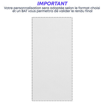 Pour personnaliser la décoration de vos espaces professionnels, la tapisserie personnalisée offre une solution adaptée. Ce modèle à effet cuir convient pour habiller les murs ou les couloirs lors d'événements d'entreprise. Il permet de laisser une impression durable auprès de vos prospects, collaborateurs et clients. Vous avez la possibilité de sélectionner la taille de votre tapisserie publicitaire parmi les options suivantes : 250 x 50 cm, 250 x 120 cm, 350 x 120 cm, 530 x 52 cm, et 530 x 120 cm. Le produit est livré en rouleau, ce qui permet de le découper pour une application en plusieurs endroits. L'installation de cette tapisserie promotionnelle se fait aisément avec de la colle à papier peint.