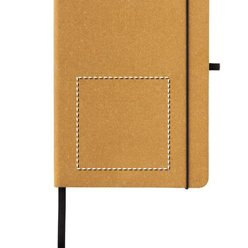 Carnet format A5 personnalisable à couverture rigide en cuir recyclé. Ce carnet est conçu pour attirer l'attention de vos prospects grâce à sa personnalisation. Il contient 160 pages lignées de couleur blanche, fabriquées à partir de papier recyclé de 70 g/m². Un élastique vertical assure la fermeture du carnet, protégeant ainsi les pages lors de son transport dans un sac, notamment lors de salons. De plus, un passant pour stylo est intégré, offrant la possibilité d'avoir un outil d'écriture à portée de main.