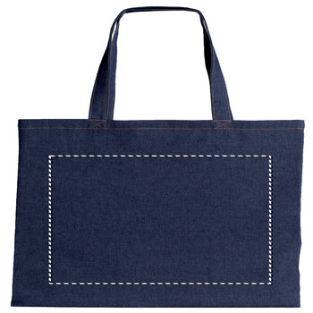 Plus qu'un sac shopping, un véritable objet de mode personnalisable. 100% coton 200 gr/m² imitation jean avec surpiqûres oranges, anses longues et capacité de 10L. Tote bag à personnaliser tendance qui ravira vos prospects et clients les plus férus de mode. Dans le sud de la France, on appelle cela une poche bien stylée ! Recyclable et biodégradable, ce goodies est personnalisé dans un atelier français. Longueur x Hauteur : 38 x 42 cm