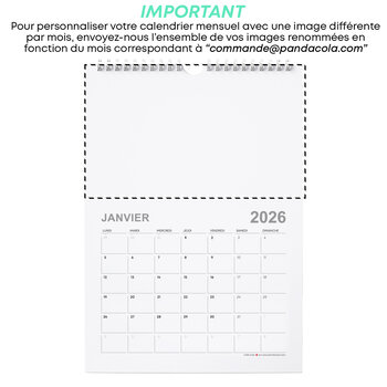 Pour personnaliser votre calendrier promotionnel avec différentes images par mois de l'année, envoyez-nous un mail à l'adresse commande@pandacola.com contenant l'ensemble de vos images, renommées en fonction du mois de l'année correspondant.