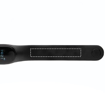 Le bracelet connecté personnalisable intègre un capteur de température. Il offre la possibilité de recevoir des notifications directement sur le bracelet, même lorsque le téléphone est hors de portée immédiate, comme dans un sac. Ce modèle de bracelet connecté peut être personnalisé pour promouvoir une entreprise ou une association, grâce à l'ajout d'un logo ou d'une image représentative.