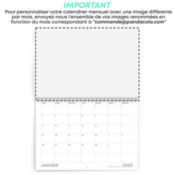 Pour personnaliser votre calendrier 2026 promotionnel avec différentes images par mois de l'année, envoyez-nous un mail à l'adresse commande@pandacola.com contenant l'ensemble de vos images, renommées en fonction du mois de l'année correspondant.