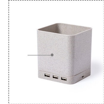 Le produit USFALA est un pot à crayons multifonctionnel. Il est constitué de quatre composants et sert de support pour smartphone, de chargeur à induction, ainsi que de pot à crayons ou porte-stylo. Il est également équipé de trois ports de chargement USB 2.0, chacun délivrant une puissance de 1A. Le chargeur à induction de l'USFALA fonctionne à une distance maximale de 6 mm et offre une puissance de 5W. Il est compatible avec tous les smartphones dotés de la technologie de chargement sans fil QI, y compris ceux protégés par une coque adaptée. Les trois ports USB peuvent être utilisés en même temps, permettant ainsi de recharger plusieurs appareils simultanément. Un indicateur lumineux s'active sur la base de chargement lorsque l'USFALA est connecté à une source d'alimentation via le câble USB/micro-USB fourni. Ce pot à crayons est fabriqué à partir de paille de blé, offrant un design naturel. Il peut être personnalisé avec un marquage au centre sur l'un de ses côtés. L'USFALA constitue un accessoire pratique et esthétique pour le bureau, idéal à offrir à vos collaborateurs.