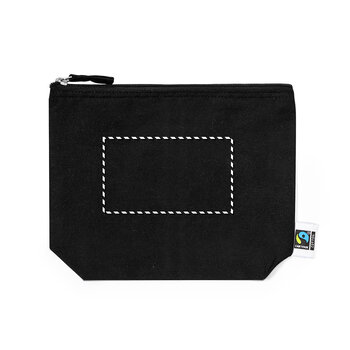 La trousse de toilette personnalisable 'Kiro S' est fabriquée en coton noir à 100%. Ce matériau est issu du commerce équitable, un système qui soutient le développement des communautés locales et lutte contre la pauvreté. Le produit est certifié Fairtrade, attestant de cet engagement. La trousse est équipée d'une fermeture éclair pour son compartiment principal et d'une poignée assortie pour un transport aisé. Elle est également munie d'une étiquette Fairtrade et d'un hangtag en carton recyclé portant le logo. Ce produit combine fonctionnalité et design sobre.