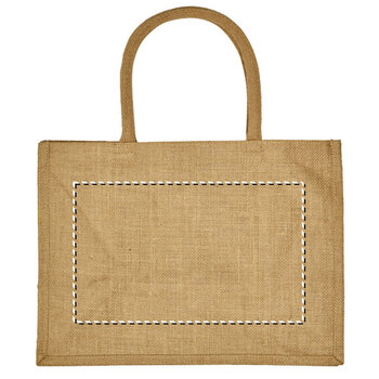 Ce sac cabas personnalisé en toile de jute 100% naturelle avec anses courtes rondes en jute également. Son soufflet de 20 centimètres et son fond plat lui confèrent une grande capacité de 19L ! Le sac personnalisable en jute est doublé de polypropylène afin de lui assurer une bonne étanchéité et tenue dans le temps. Cadeaux personnalisés idéal pour les commerçants et les commerçants sur éventaires et marchés. Nous vous conseillons une personnalisation simple, sans petits éléments, et limitée à une couleur afin d'obtenir un résultat d'impression optimal. Personnalisé en France. Longueur x Hauteur x Largeur : 36 x 27 x 20 cm.