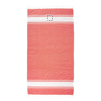 Cette fouta personnalisée faite en coton recyclé à 80% et en polyester recyclé à 20% est légère et facile à transporter tout en offrant un grand confort grâce à son grammage de 180 gr/m² et son côté éponge doux. La serviette mesure 90 x 170 cm, de quoi vous offrir une surface suffisamment grande pour vous allonger confortablement ou pour vous asseoir et admirer la vue sur la plage. Les franges ajoutent une touche d'élégance à l'ensemble. Marquée du logo de votre entreprise ou d'un message promotionnel, cette fouta personnalisable est un produit publicitaire idéal à offrir à vos clients ou collaborateurs pour les accompagner lors de leur séjour à la plage.