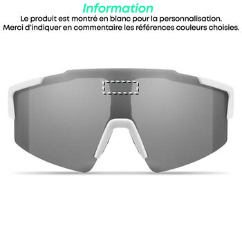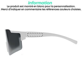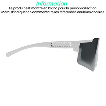 Ces lunettes de soleil sportives sont conçues pour une utilisation dans un large éventail d’activités en extérieur : course à pied, cyclisme, voile, tennis et autres pratiques sportives. Elles contribuent à réduire l’éblouissement et à améliorer la visibilité en plein soleil, favorisant le confort visuel pendant l’effort. Leur forme enveloppante permet une bonne tenue sur le visage, adaptée aux mouvements répétés. Grâce à leur design léger, elles s’intègrent facilement dans une routine sportive sans encombre. Ces lunettes de soleil personnalisables sont bien-sûr conformes à la norme EN ISO 12312-1 et UV 400. Elles ont pour particularité d'être entièrement personnalisables en mix & match, cela vous donnant la possibilité de composer les lunettes correspondant le plus à vos besoins. Vous avez le choix sur la couleur des éléments suivants, à savoir : les branches, le cadre, les verres et la finition du produit. Ces lunettes représentent un support publicitaire intéressant dans le cadre de campagnes de communication ciblant les amateurs de sport et elles peuvent également être distribuées lors d’événements sportifs, de lancements de produit ou intégrées à des kits de bienvenue.