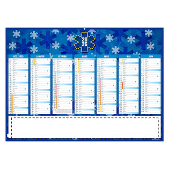 Ce calendrier bancaire personnalisable présente un thème illustré dédié aux ambulanciers, mettant en valeur leur métier à travers des visuels représentatifs. Il propose une vue de 7 mois par face, imprimée sur un format contrecollé rigide et cartonné. Trois tailles sont disponibles : 55 x 40,5 cm, 43 x 33,5 cm et 27 x 20,8 cm. La grille calendaire comprend les saints, les numéros de semaines, les phases lunaires, les congés scolaires ainsi que le compte et le décompte journalier (compte et décompte non inclus sur le format 27 x 20,8 cm). Il dispose d’un trou de suspension pour une installation facile sur tout support vertical. Ce calendrier publicitaire illustré s’intègre facilement dans une stratégie de communication ciblée auprès des acteurs du secteur médical ou des services d'urgence.