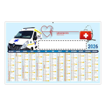 Ce calendrier personnalisé est illustré sur le thème de l’ambulance, en intégrant les couleurs et symboles visuels liés à cette profession. Il s’adresse tout particulièrement aux acteurs du secteur médical, aux services de secours ou aux entreprises liées au transport sanitaire. Conçu sur un format contrecollé rigide et cartonné, il affiche 13 mois au recto. La grille calendaire comprend les saints, les numéros de semaines, les phases lunaires, les congés scolaires ainsi que le compte et décompte journalier. Le verso reste vierge. Ce calendrier personnalisable est proposé avec ou sans coupe, selon le besoin. Il constitue un support pratique et reconnaissable qui peut être posé sur un bureau, dans un cabinet, ou un centre de soins. Ce modèle est une option pertinente pour toute campagne publicitaire ciblant les professionnels du domaine médical ou paramédical.
