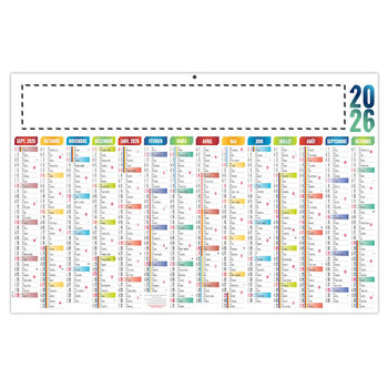 Ce calendrier bancaire publicitaire est conçu pour offrir une vue complète sur l’année avec une grille calendaire illustrée sur 14 mois, de septembre 2025 à octobre 2026. Disponible en trois tailles : 55 x 40,5 cm, 43 x 33,5 cm et 27 x 20,8 cm, ce calendrier au format contrecollé rigide est équipé d’un trou de suspension pratique. Multicolore et structurée, la grille intègre les saints, les numéros de semaines, les phases lunaires, les congés scolaires ainsi que le compte et décompte journalier (compte et décompte non inclus sur le format 27 x 20,8 cm). Le format 27 x 20,8 cm propose uniquement une grille de 12 mois. Ce calendrier personnalisable offre un support publicitaire efficace, visible tout au long de l’année. L’espace disponible permet l’ajout de votre visuel, logo ou message, idéal pour les campagnes publicitaires qui visent une diffusion large et régulière dans un environnement professionnel ou grand public.
