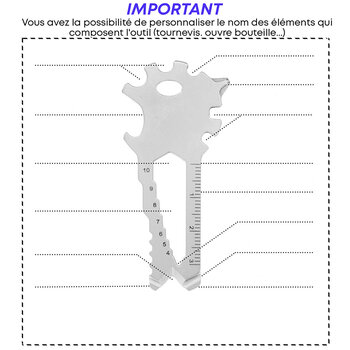 Découvrez notre outil multifonctionpublicitaire en forme de lion, une véritable bête d'utilité en acier inoxydable robuste. Cet outil de poche promotionnel offre pas moins de 22 fonctions pour répondre à tous vos besoins.Cet outil porte clé personnalisable polyvalent comprend un porte-clés, deux clés à rayons, trois nettoyants pour barbecue, deux tournevis plats, un tiroir à clous, un tournevis cruciforme, un dénudeur de câble/coupe-fil, un décapsuleur, une règle centimétrique et une règle en pouces. De plus, il est équipé d'une jauge de profondeur de bande de roulement de pneu (1,6 mm) et d'une clé à écrou papillon. Compact et puissant, cet outil en forme de lion est votre compagnon idéal pour toutes vos aventures et tâches quotidiennes. Ajoutez une touche de férocité pratique à votre quotidien avec cet outil multifonction en forme de lion, prêt à rugir pour vous assister à tout moment. La personnalisation du papier support est possible à partir de 100 pièces. La description fonctionnelle est en allemand mais peut être en anglais sur demande dans les commentaires.
