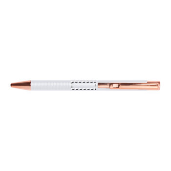 Ce stylo incarne l’élégance et la fiabilité, parfait pour les professionnels souhaitant allier style et performance. Conçu en aluminium robuste avec une finition mate, il se distingue par ses détails cuivrés raffinés et son design équilibré, disponible dans une large palette de couleurs modernes. Doté d’un mécanisme poussoir fluide et d’un clip métallique solide, ce stylo publicitaire personnalisable offre une excellente prise en main et un confort d’écriture optimal. Sa recharge jumbo à encre bleue assure une écriture longue durée, idéale pour un usage quotidien ou professionnel. Présenté dans un sachet individuel recyclé, ce stylo personnalisé est un cadeau promotionnel parfait pour vos événements, séminaires ou actions de communication, combinant esthétique, durabilité et visibilité de votre marque.