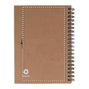 Le carnet à spirale personnalisable présente une couverture rigide en carton recyclé. Ce bloc-notes est composé de 70 feuilles de papier blanc recyclé avec une finition kraft et est équipé d'une fermeture par bande élastique. Un stylo à bille biodégradable de couleur bleue est inclus avec le carnet. Cet accessoire de bureau est fabriqué à partir de carton recyclé. C'est un outil de bureau très pratique, conçu avec des matériaux naturels. Montrez votre engagement au sein de votre entreprise en offrant à tous vos collaborateurs un carnet à spirale personnalisable. Ajoutez un logo coloré sur le fond naturel du bloc-notes pour maximiser sa visibilité.
